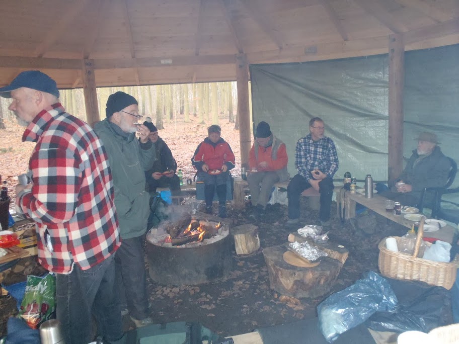 Vi mødtes kl. 12 medbringende diverse hjemmelavede retter, der så blev fortæret rundt om et stort flot bål. De fleste af os nød en enkelt øl, for alle skulle ud på vejene bagefter. Vi var 11, som plejer at ro sammen på vore onsdagsture, der denne dag var samlet i bålhytten.